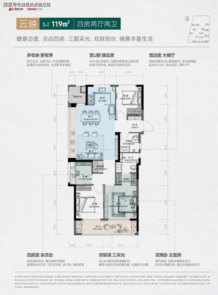 若是三房不够住,建面约119㎡的户型则在面积和功能上做到完美的平衡。