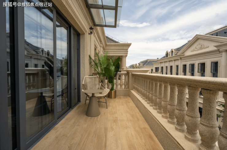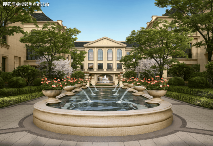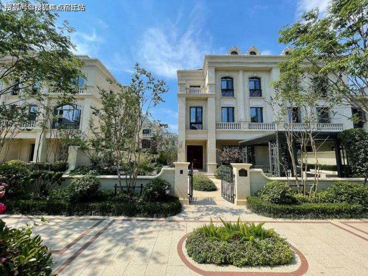 整个园区,以经典的绿城法式墅区景观大中轴贯穿,占地约1000多㎡,联排建筑的设计,融合了中国传统院落布局与法国枫丹白露宫的审美,外立面大面积采用全石材干挂,檐口等细节部位使用仿石。