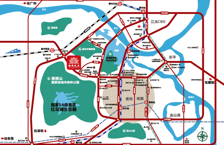 市中心的生态区:高榜山脚下、红花湖景区与惠州西湖左右相伴,背靠惠州市植物园。区政府、图书馆、西湖大剧院、文化馆及青少年宫……生态、文化、自然多重资源叠加,生活格调与众不同。