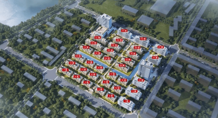 在技术指标上,我们清晰的看到,排屋、洋房、小高层,全都是200㎡以上的户型,纯改善配置。除此之外,还有2栋14层和17层的商业办公楼,以作他用。我们大概测试了一下,从小区步行至南湖,不过200多米,而小区的小高层是可以穿过西面的栖凤苑,直望湖景。