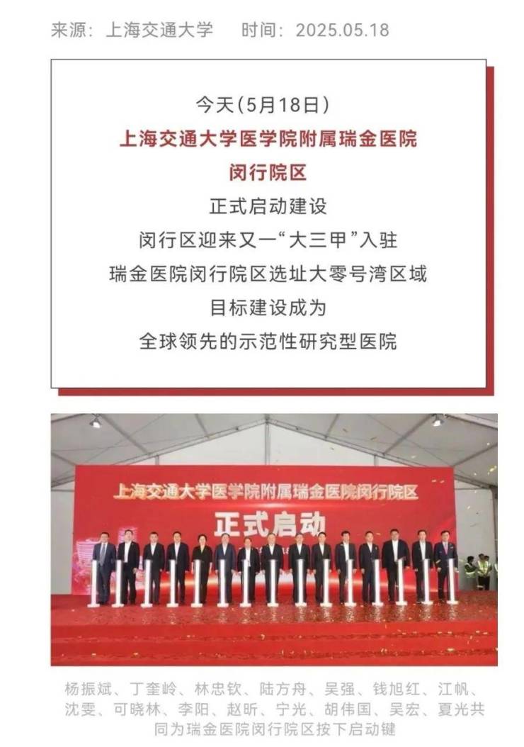 三甲医院:上海交通大学医学院附属瑞金医院闵行院区已于2025年5月动工,2028年正式营业。