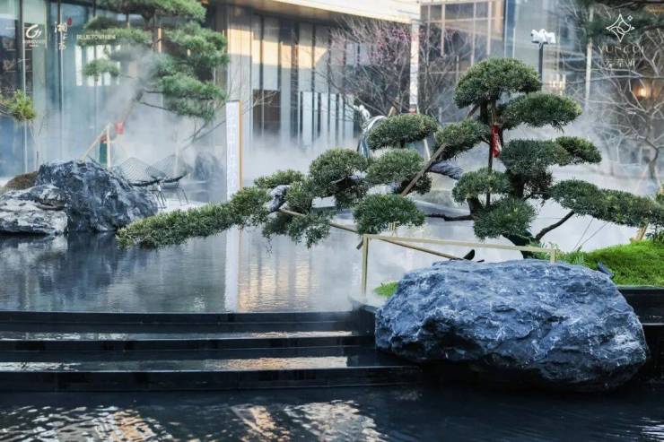 从松澜引阙启程,涌泉、松影与奢石景墙虚实相映,营造“未入园而先见山”的归家礼序。门头为铝板结合PRADA绿天然石材长度约35米,门头和两侧的奢石景墙共计长约70米,格调雅致而不张扬,实现园内与园外的诗意渗透。