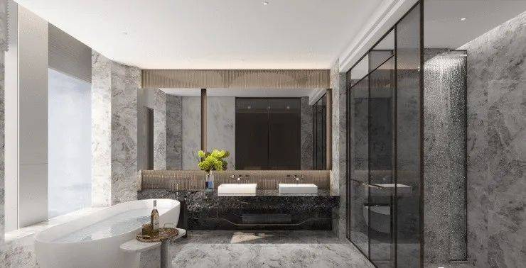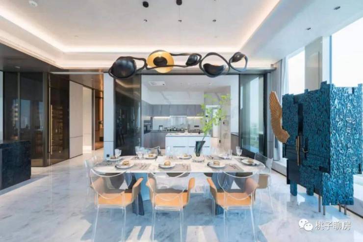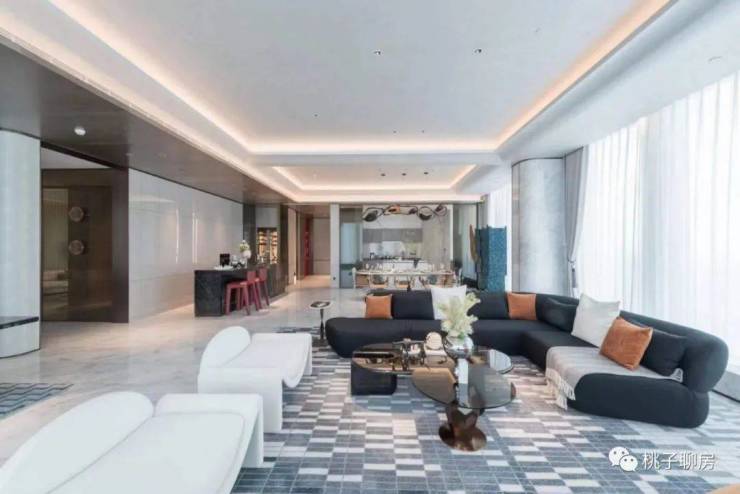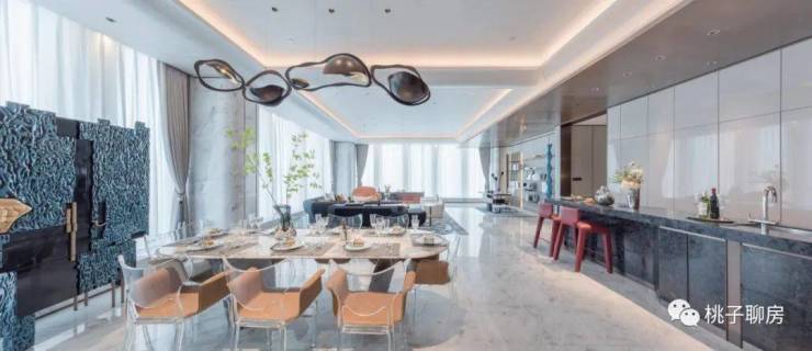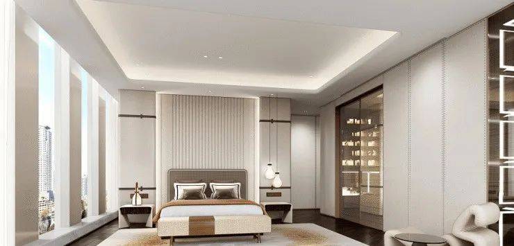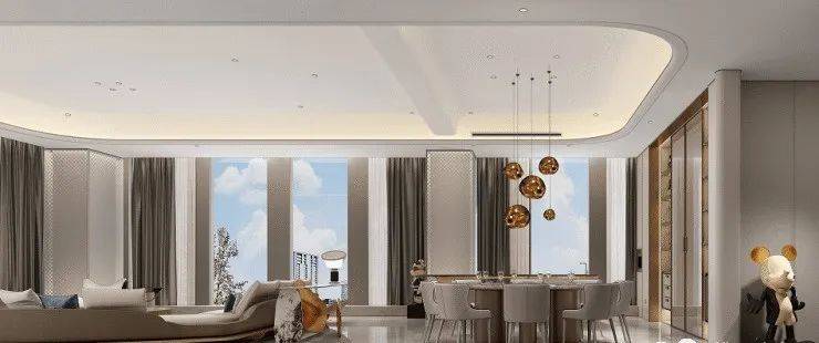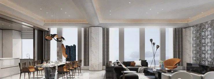 室内设计上,采用LDK一体化设计,带来极具阔正的空间尺度,并以大面米灰、暖灰为主基调,营造出高级优雅的氛围感,同时通过吊灯、艺术玻璃、酒柜等软装艺术作点缀,将艺术与生活融合,简奢中透出时尚前卫,营造出私密、温暖、现代化、国际化及独特的鼎级舒居体验。