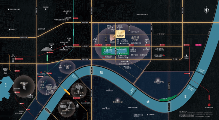 项目位于钱塘区地处金沙湖板块核芯区,一脉承接钱江新城、钱新2.0,承载钱塘区大量企业总部需求的同时,又可坐享核心地段的环湖高光配套赋能,杭州第四座CBD-金沙湖商务区已然成形。