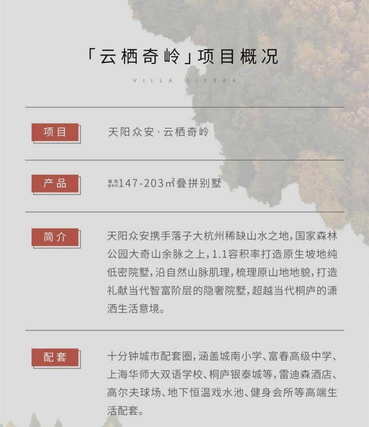 本项目推广名为“云栖奇岭”,核准地名为“云栖奇岭府”。本宣传资料仅为要约邀请,相关内容不排除因政府相关规划、规定及开发商调整而发生变化,对项目周边环境、交通、教育及其他配套设施的介绍,旨在提供相关信息,不意味着本公司对此作出了承诺,ZUI终以政府批准规划文件为准,买卖双方的权利义务ZUI终以双方签订的《商品房买卖合同》为准。本公司保留对本广告修改的权利,敬请留意ZUI新资料。开发商:杭州天奇置业有限公司,预售证号:桐售许字(2021)第ZJ02183号。本资料制作时间2021年12月,有效期1个月。