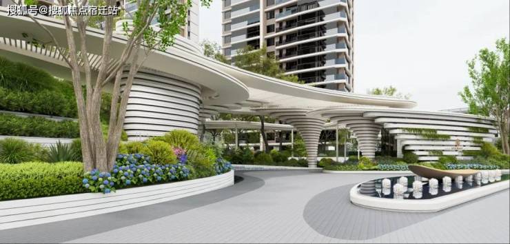▣ 先锋审美 艺术界面:以 “未来水岸” 定位重构入口艺术,用极具未来感的流动几何线条、立体生态呼应运河生机,开放式前场柔化社区与城市边界。
