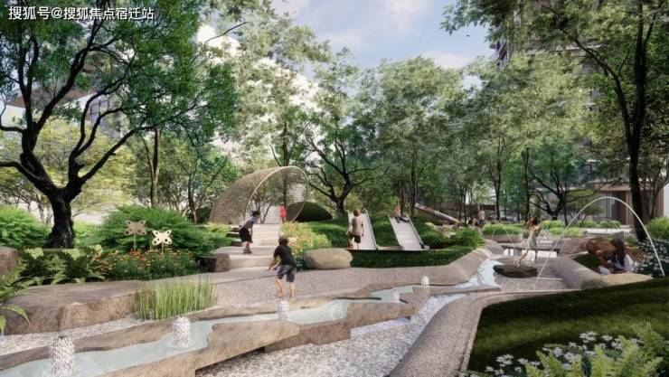 ▣ 下沉庭院 浮岛花园:跌水叠瀑造诗意水景,垂直复合手法打造高质度假感