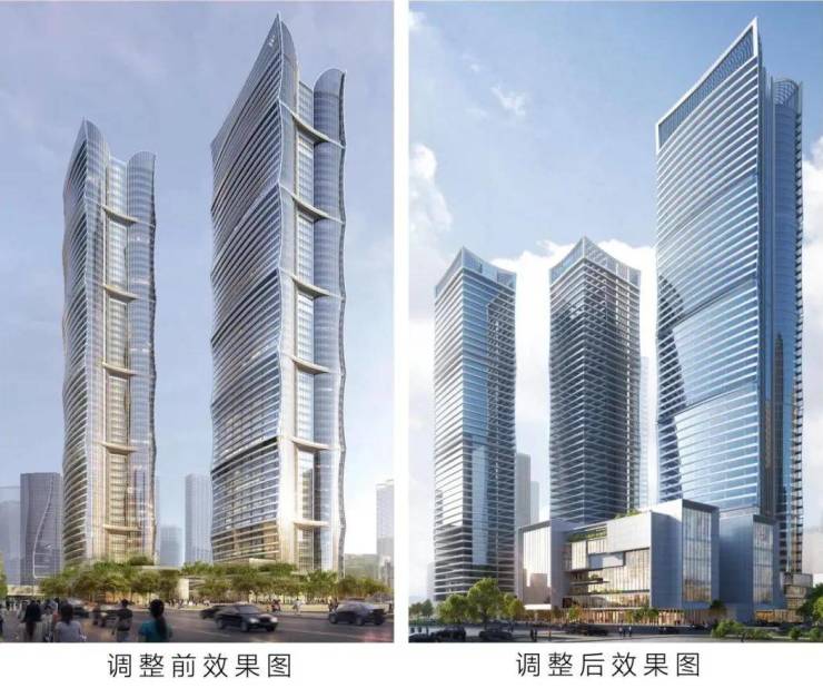 从最新公布的调整后的效果图来看,外观依然是风帆+竹节造型,主塔楼由原先的7节调整为4节,副塔楼由原先的6节调整为5节。新方案既遵循限高标准,又以多栋联动的建筑群重塑城市界面。
