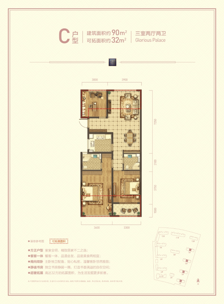 建筑面积约130㎡, 功能上可以说是自住一步到位的上佳选择。餐厨比邻,动线合理; 近20㎡主卧,私享衣帽间、独立卫浴、景观飘窗;北向独立书房,可创变为游戏房、茶室、儿童房等,拓展生活N重可能。 张弛有度的背后金城 路、地铁旁活力住区,机遇当前,敬请把握。