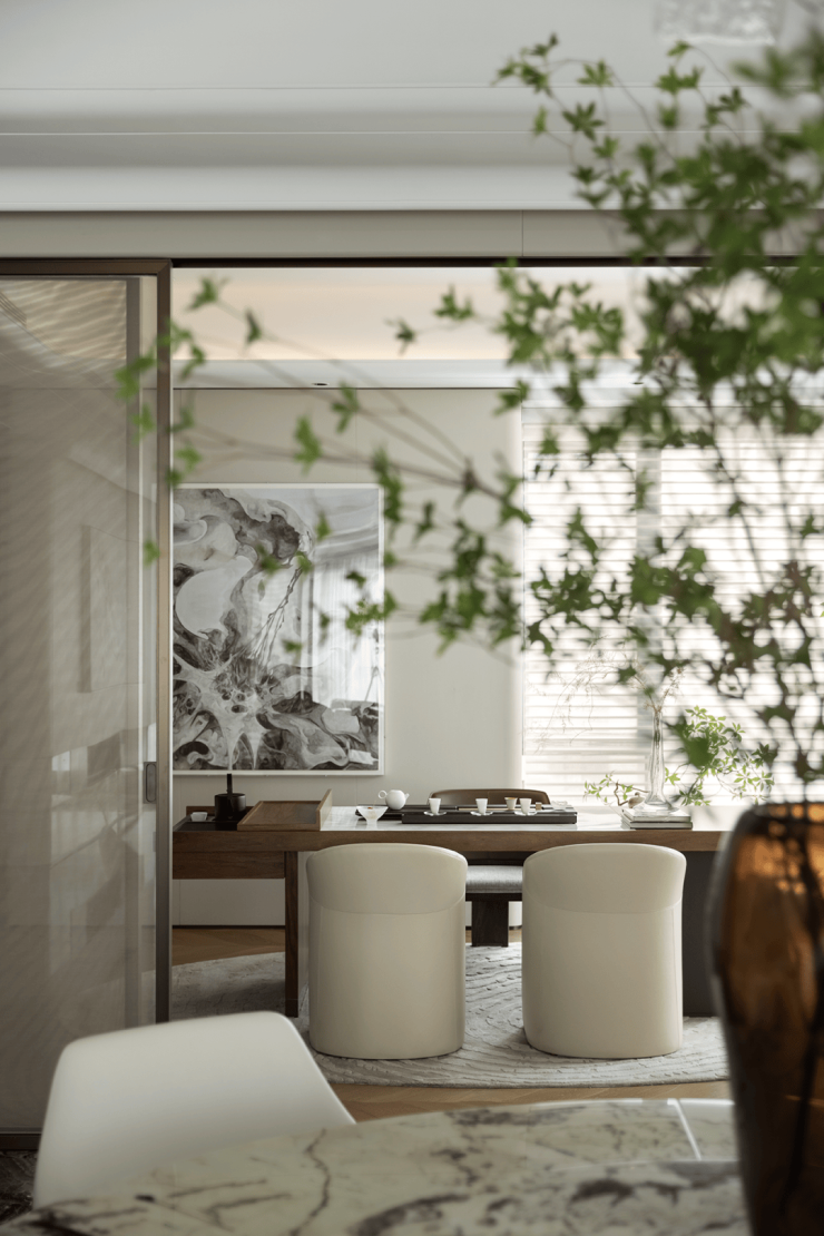 在茶室,设计师选用木美MaxMarko品牌,中式圈椅造型美学辅以天然皮革材质,温润的大理石结合古韵实木,古朴典雅又符合现代美学,在不同材质的碰撞中,探讨当代茶与生活方式的融合。一抹绿意伸展,袅袅烟影落于晴窗,私藏一隅东方雅韵,阅尽书籍的历史厚重感,在茶香与墨香中沉淀生命诗意。