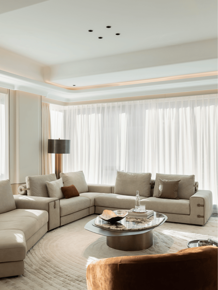 以空间收纳欢悦的时光,为生活赋予艺术的慰藉。约270°环幕社交三联厅,相连开合厅,通过空间的布局和光影的配合,场域与场域的贯通,营造为充满艺趣的社交场景,混合交叉又充满个性,开合之间,私密会客、开放式交流,家庭成员的个性需求,都一一得到照顾。