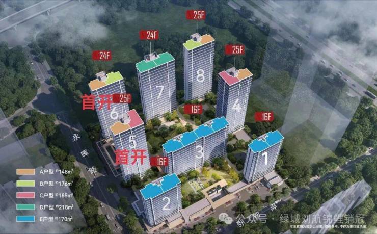 规划高层8幢(16-25F),呈现南低北高布局。其中 ,南面1-3#为小高层16F,其余5幢为高层24-25F。
