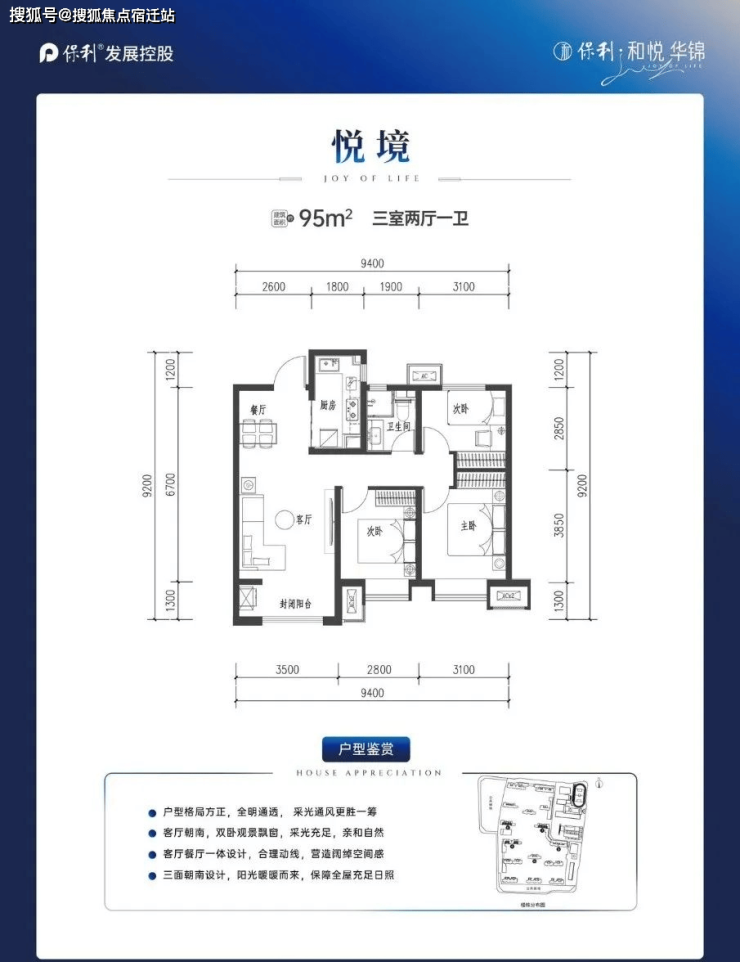 保利和悦华锦目前在售最小户型为95平小三居,户型方正,利用率高,采光面大,好楼层可选,特批房源九千三四百左右。