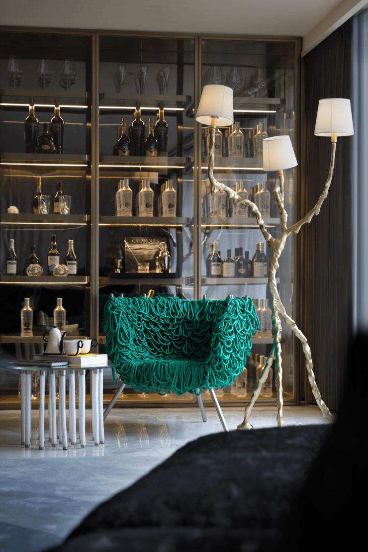 约300㎡“观湖”,谢柯打造;另一款是更宽舒的约412㎡“行云”,出自邱德光。尤其是约412㎡“行云”,无论玄关处雪花白、劳伦黑金、金世纪的大胆拼花,瓦楞式的波浪形电视背景墙,还是吸睛的普拉达绿石材吧台,全屋随处可见出色审美和奢华材质的完美结合。