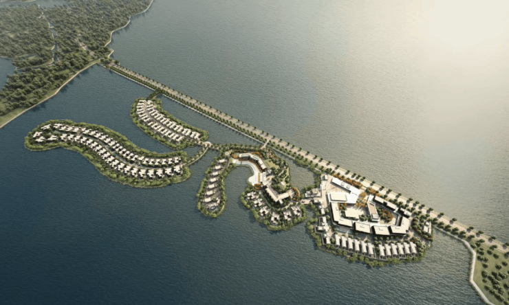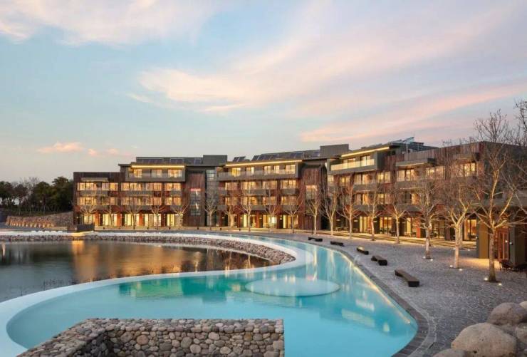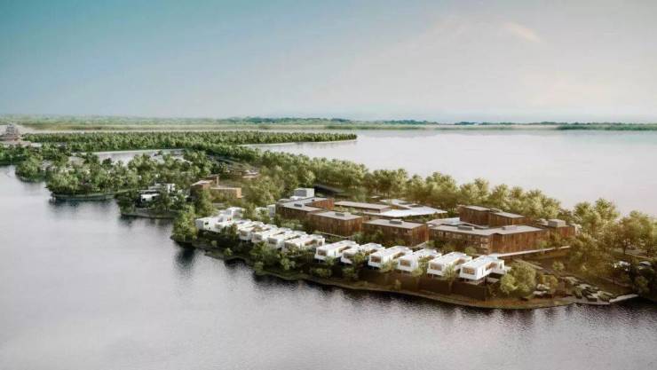俯瞰仿佛马尔代夫度假村的建筑格局。阳澄湖上长长的一线铺展开来,被波光粼粼的湖水环抱。