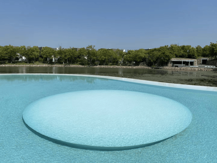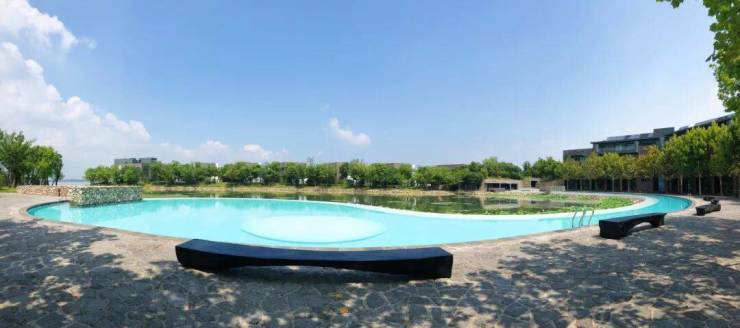 室外弧形泳池。将阴阳融合到设计中,泳池与阳澄湖呈现完美的太极符图。搭配灯光设计,绝美!