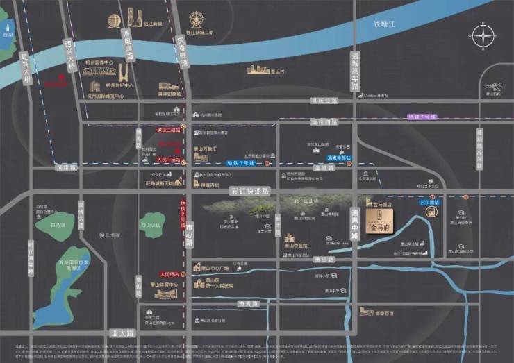 ◈ 山水自然:北靠北干山,毗邻北山公园;东面商城河,直享沿河绿道;余暨公园、城河公园等在旁,与诗意自然无界。