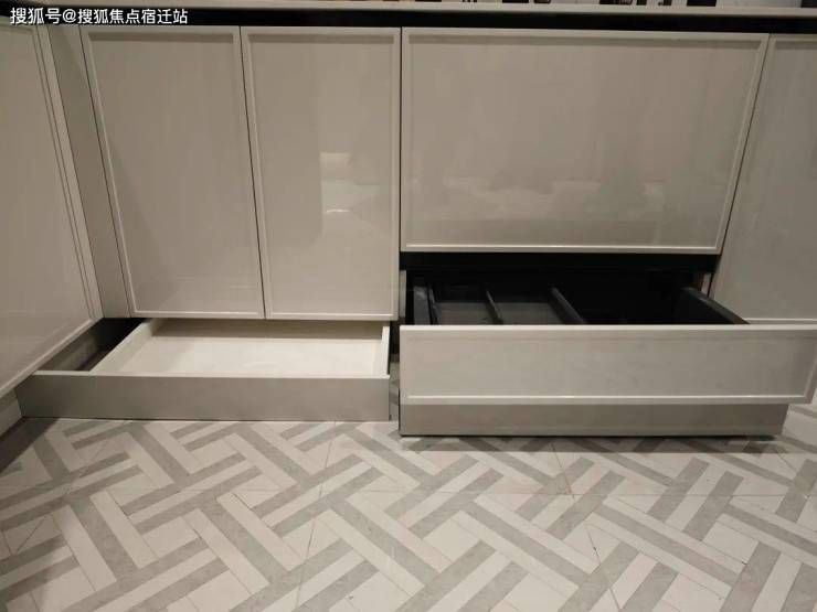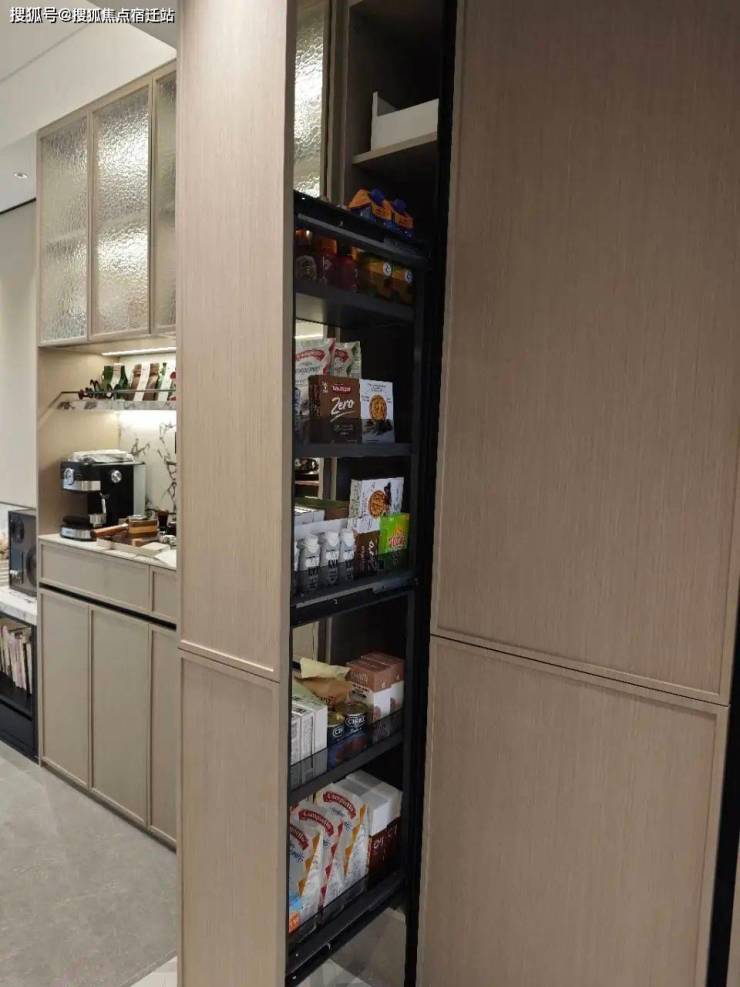 也可以厨房里,随手一拉就满满当当,整齐划一的橱柜、拉篮、餐边柜等;
