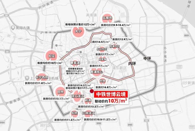 目前上海内环核心地段新房价格遍地15万/㎡+、内中环普遍来到12万/㎡+;
