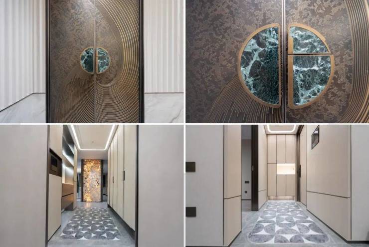 例如金属雕纹的装甲门、白色系玉石的定制门牌号、白雪公主透光云石的玄关柜面、内置消杀机的鞋柜、圆弧吊顶和感应灯、普罗旺斯水晶灰岩板背景墙以及地面拼花设计、定制墙纸、全屋智能化系统,中铁世博云境的品质细节武装到了牙齿!