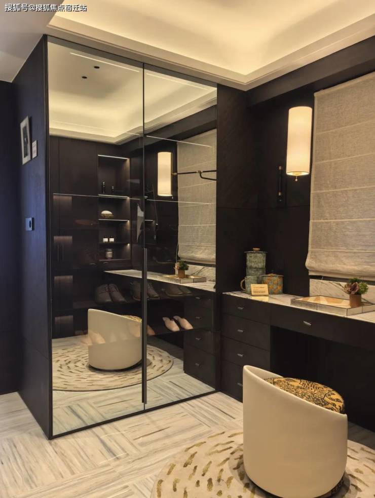 进门之后正对艺术玄关,背景为威尼斯棕石材(交付),在两侧设置弧面半包裹造型(交付),给到满满的归家仪式感。