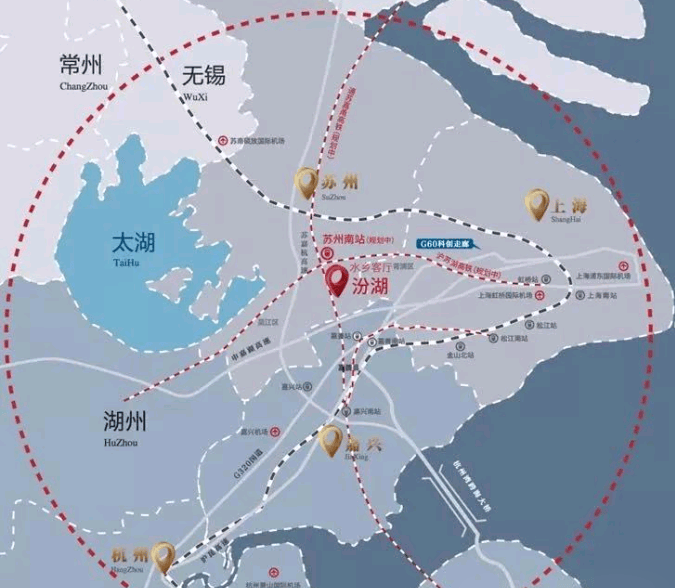 苏州南站(汾湖站)位于长三角一体化先启区——汾湖,沪苏湖铁路、通苏嘉甬城际高铁于此呈“十字”交汇,其中沪苏湖铁路由上海虹桥枢纽引出,途经上海松江、苏州吴江,至浙江湖州站,通车后将实现由汾湖8分钟到松江,20分钟到达上海虹桥枢纽,将汾湖与上海更紧密的联系在一起。