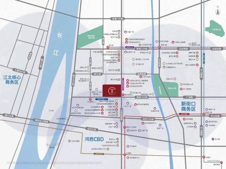 地铁上盖 快速通行要核:地铁9号线(在建)和13号线(规划)交汇处的管子桥站上盖,畅联城市全域。江东北路和清凉门大街双主轴交汇,快速链接河西CBD、鼓楼、江北新区等商务桥头堡,便捷交通,通达全城!