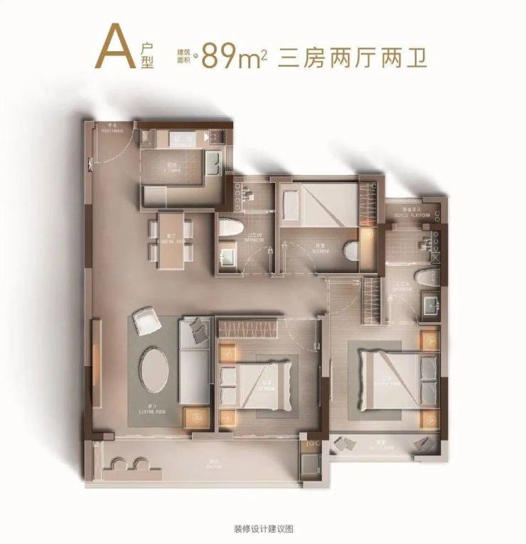 建筑面积约89㎡户型做到三房两厅两卫,三开间朝南,主卧还配有独立卫生间。南向建筑约6.4米阳台。还有开放式的餐客厅一体化设计,舒适宽敞。