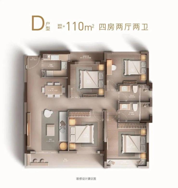 建筑面积约110㎡均为边套户型,纵享丰富观景视野,四房两厅两卫设计并蓄尺度感与尊崇感。