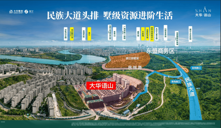 大华语山所在青秀东滨江低密板块,民族大道东头排,仅一个红绿灯,约15分钟直达东商区,万象城、盛天地、航洋、山姆会员店等城市最优质配套近在咫尺。