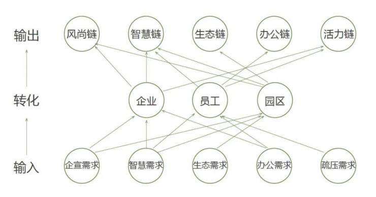 在新经济发展理念引领下,设计希望营造科技智慧、乐活办公、生态赋能的现代智慧景观园区。通过分析产业园使用者——企业、员工、园区需求,设计将整个智慧园区比作大脑,而身处其中的使用人群提出使用条件,输入到园区大脑,通过园区的反映,输出不同的功能链模块,以“模块集成”的手法将多样的空间模块聚合为一座有机而高效的SMART PORT。