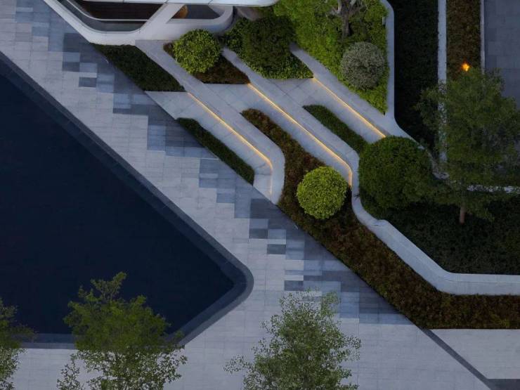 设计将道路分级打造,为不同需求设置不同宽度等级,形成全区有机动脉,提升场地各部位之间的通行效率。场地内部将车行路设置为单行环形路,将主要车流尽快引入地库,同时车行路串联建筑出入口,实现VIP车辆下车入户功能,提高尊贵感。