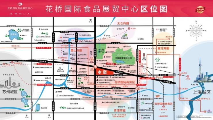 项目所在地“昆山市”GDP连续19年位居百强县(市)首位,花桥素有“江苏东大门、上海后花园”之称,全国百强镇综合实力排名第五,紧抓轨交“双11号线”在花桥无缝 衔接的重大机遇,做深“虹桥一花桥”双桥联动,打响“上海有虹桥、苏州有花桥”品牌,一小时经济圈辐射人口超5000万,为本项目提供广大消费客群。