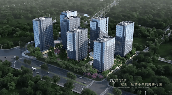 整个园区以围合式布局展开,七幢建筑借鉴中国古典园林的精髓,最大楼间距达到了63米,使得每栋楼都能享受到270°的开阔视野,仿佛是一座座隐匿于花园中的岛屿。为了与景观相呼应,园区立面采用“水晶天幕”设计,线条纤细,使建筑宛如天空中垂下的纯净湖面。