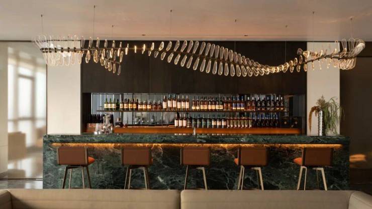 艺术风帘水幕,搭配名贵沙朴植种,彰显归家轴线的仪式感;近40米超宽挑大堂,以艺术作品感的形态与镜面艺术水景交相呼应,太阳纹定制铺装,营造出全球顶级酒店风格的落客区环岛,盛迎「胤璞」名仕归;更打造“不离繁华而获山林之怡,大隐于市而有林泉之欢”的绿景宁谧空间,俯拾自然野趣。