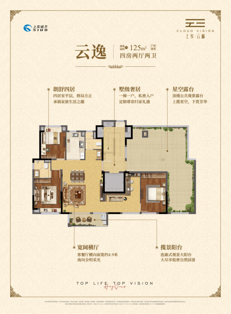户型点评:建面约125㎡4房2厅2卫,一梯一户设计,专属入户空间。该户型做到了四开间朝南+主卧套房设计+卫生间干湿分离,超大南向采光面,室内通透明亮;客餐厅相连,约4.9米大面宽横厅,客厅南连观景大阳台,会客区空间宽奢、大气;主卧套房设计,带独立卫生间和飘窗,专属于主人的私密空间;该户型享受了墅居体验,是三代同堂优质户型之选。