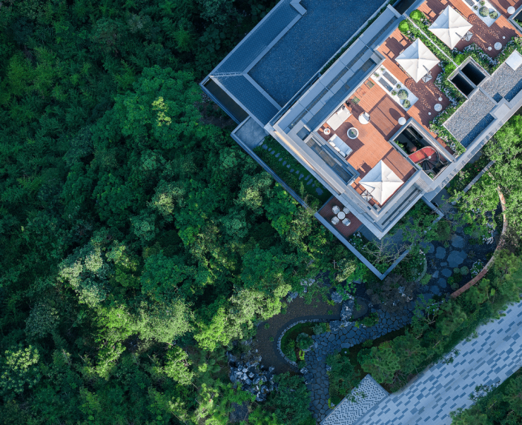 在杉林掩映间,玻璃山墅依山势次第展开。推开窗户,便是扑面而来的时间的山谷;迈进露台,又仿佛被自然山水所包裹;身处其间,即可摒弃杂念,开启一种全新的、充满创造力的生活。