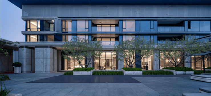 质感更加温和的玻璃栏杆代替冰冷围墙,既保证了私家领域感,也兼顾园区-城市的视觉交互。