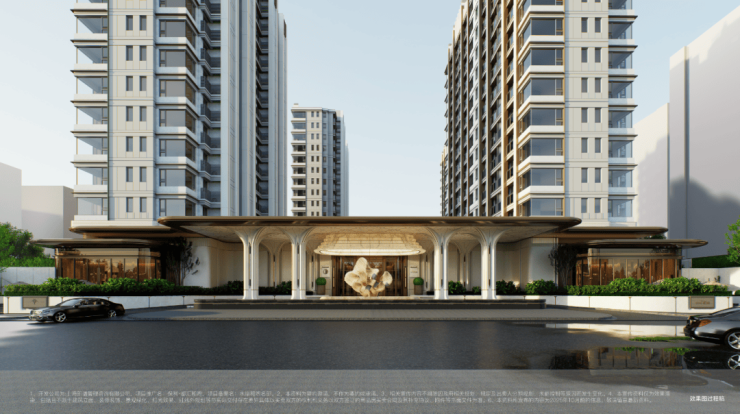 社区门庭宽达约百米,约350米的城市华墙界面,媲美高奢酒店门庭。