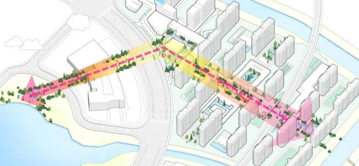开放共享轴链接各个节点:生态运动休闲带,生态林荫大道,街区绿地;形成连续的绿色公共、半公共空间。并在绿地中注入国际文化特点的商业配套,形成尺度宜人的街道和建筑尺度。