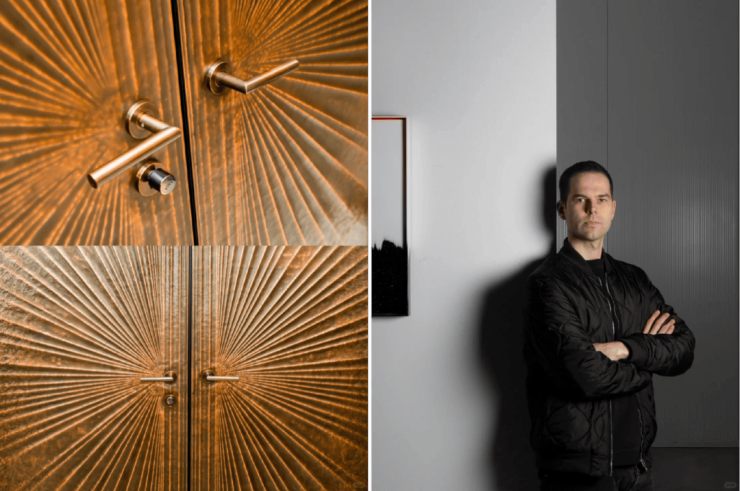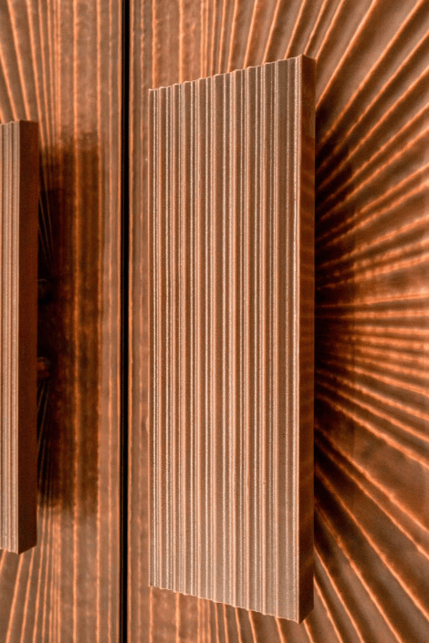 缦合甄选 【Noblesse 50周年纪念款铜门-扎哈联名】 ,由建筑大师扎哈·哈迪德的门徒——Stefan Bassing 亲自执笔设计。其门板上的放射状肌理,并非机器压铸,而是由德国老匠人捶打而成。每一道纹路,都是独一无二的手作印记,传递出金属的生命感与时间的光泽。