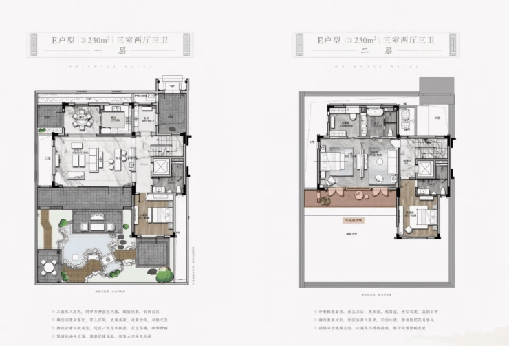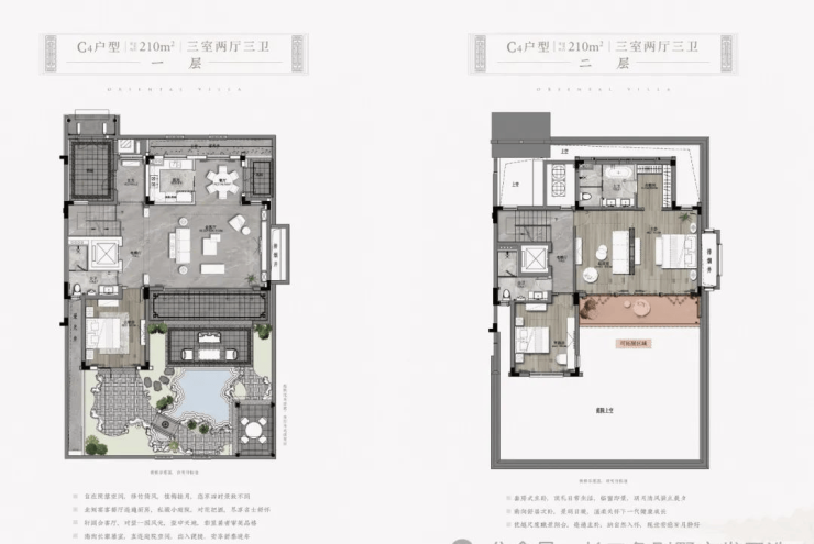 联合GOA大象设计公司(原绿城东方设计院的凌建先生的团队),通过降低建筑密度和容积率(容积率为0.614,建筑密度30%,以中式建筑中的江南民居形态创作出特有的两层合院产品)。