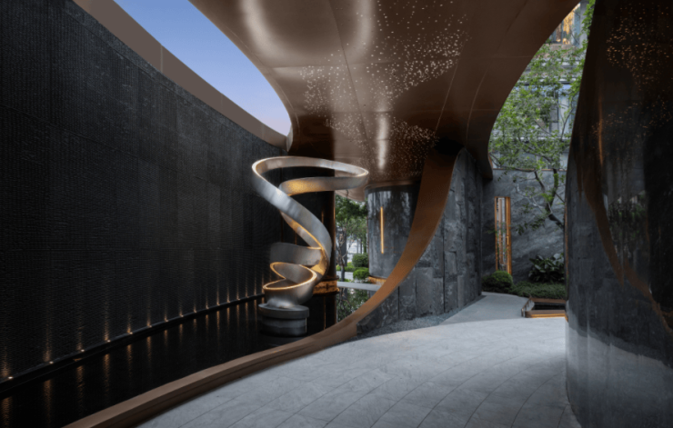 从园区入口开始,绿城·凤咏朝阳便展开优雅尊贵的生活礼仪。主入口超长雅趣门厅,取意“退隐”的艺术之意,通过横向延长的约80米长庭,柔化过渡与城市的界限,转身便愉悦在沐光悠廊、迎宾礼仪水景的视觉观赏中,进而投身到艺术会所的“心灵的疗愈”里。