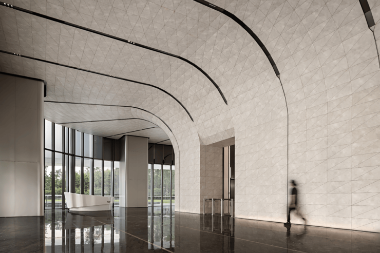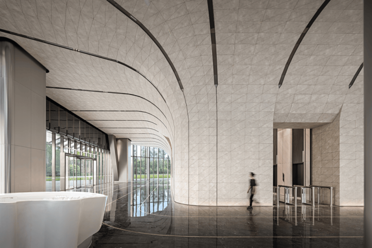 建筑造型简约内敛,表皮随着光线的折射而呈现出极具流动性的线型变化,呈现钱塘江潮汐的涌动与起落,形成丰富的立面韵律,仿佛是一组节律变幻的城市音符,以回应“钱江潮涌”的独特的潮汐现象。目前,项目已完成建筑外墙的多段典型视觉样板的确认。