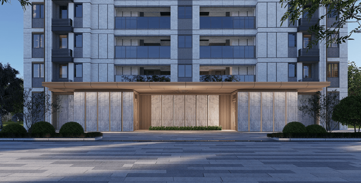 首层基座采用人造石材+铝板等装饰材料,增强建筑整体感和精致度;顶层外挑飘板使建筑立面更加清晰,层次感更丰富。