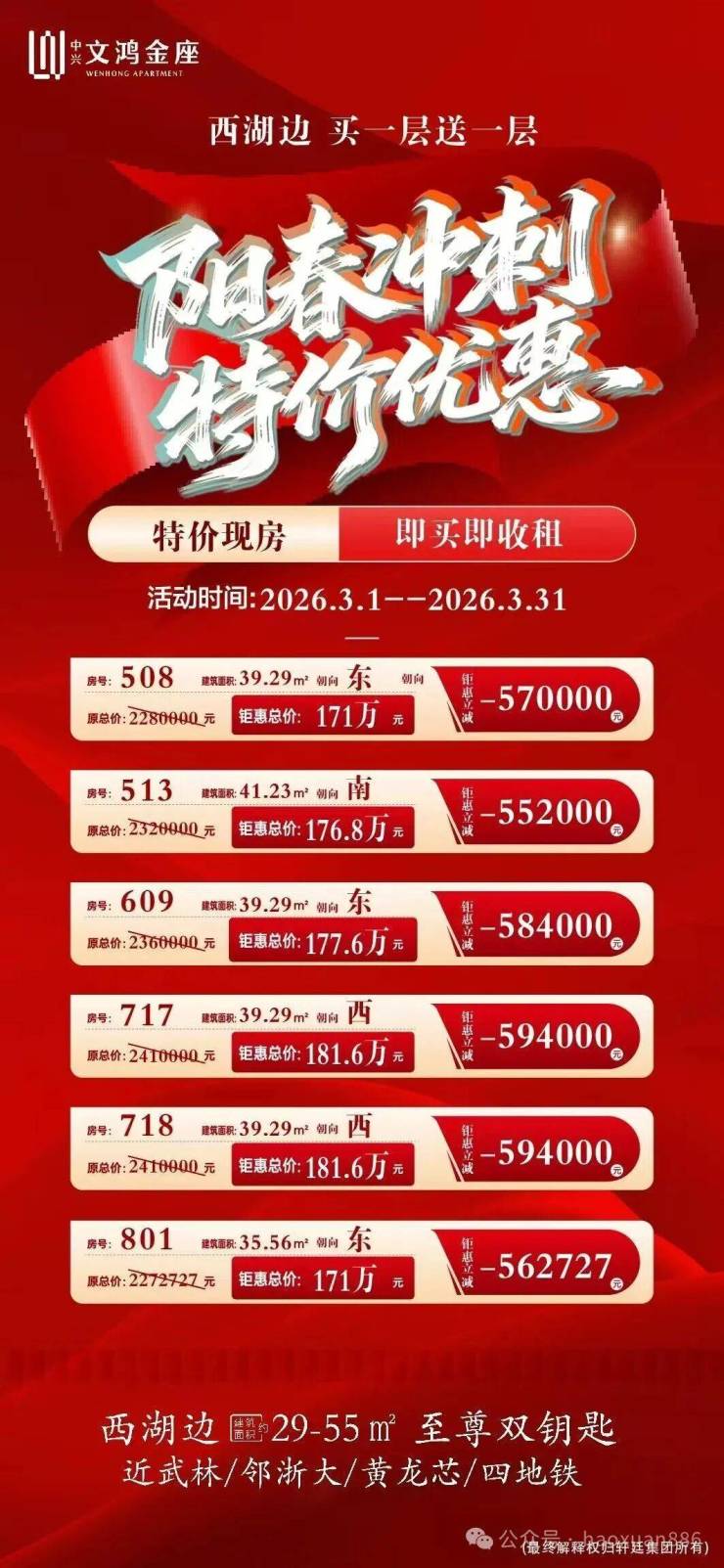 文鸿金座主推建面约29-55㎡精装公寓,参考单价仅47000元/m²起!在西湖区核心地段,这样的价格堪称“性价比之王”! - 小面积,低总价:轻松上车杭州核心区,无需承受高昂房贷压力。 - 灵活用途:自住、出租、办公皆宜,租金回报率可期,资产保值增值无忧。 -精装交付:省去装修烦恼,拎包入住,即刻享受品质生活。