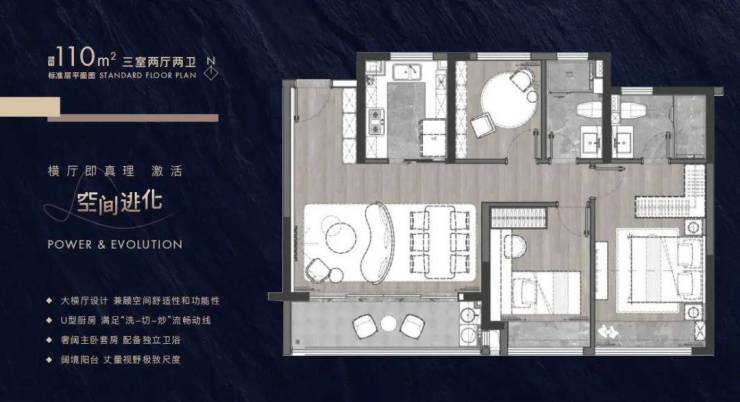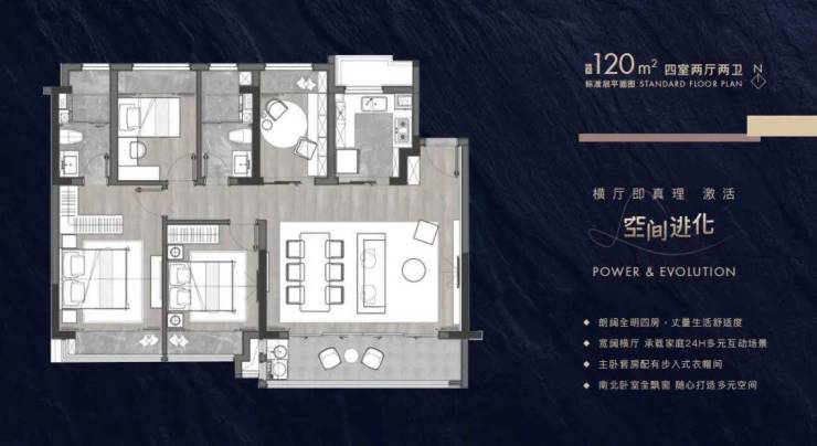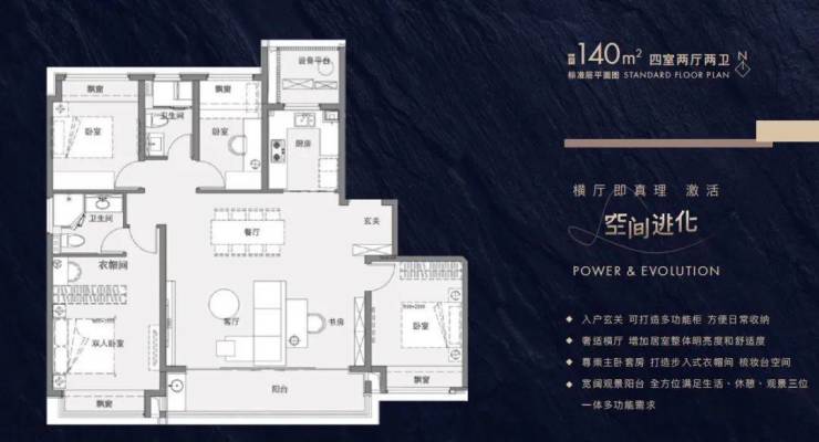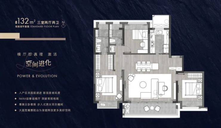 建筑面积约102-143㎡进阶户型带来全生命周期的舒居空间,全横厅设计诠释大尺度场景,阔境阳台、主卧套房设计,配备有独立卫生间和衣帽间,满足面面俱到的理想人居。