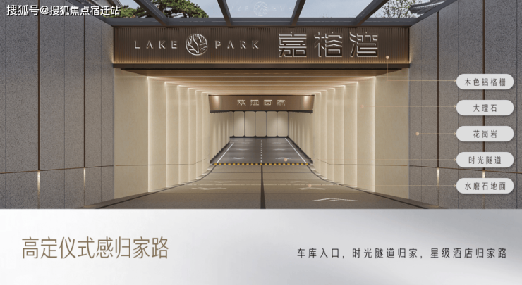 地下车库采用劳斯莱斯星空顶设计理念,通道精装处理。车库入口打造时光隧道式空间,水磨石地面、木色铝格栅、大理石与花岗岩等材质搭配运用,呈现星级酒店式归家体验。
