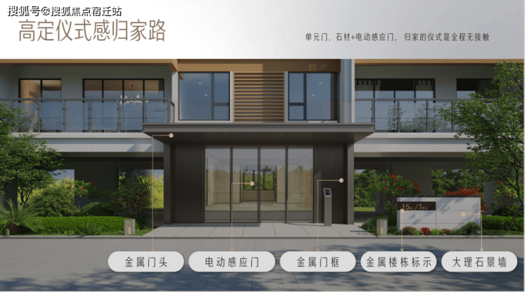 单元门采用石材与电动感应门组合,实现无接触通行,提升归家便捷性与仪式感。金属门头、金属门框、金属楼栋标示与大理石景墙等元素,构筑精致且具有辨识度的建筑外观。