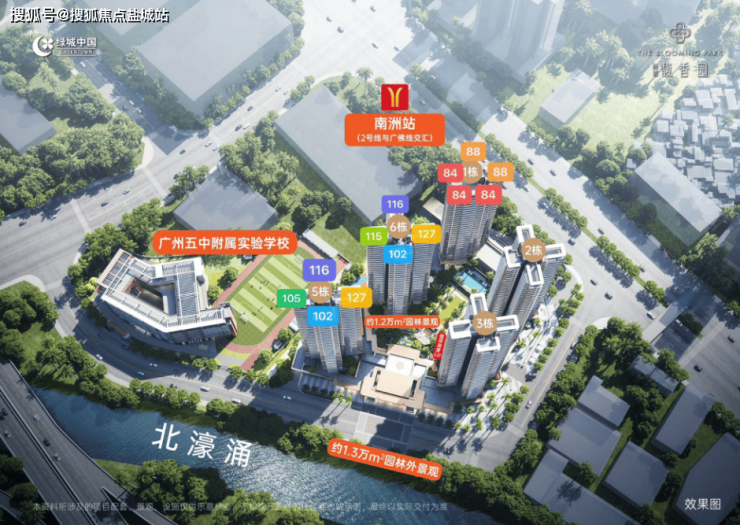 从外部来看,项目背靠河涌,打造了一个滨河公园,与周边的海珠儿童公园、海珠湖、海珠国家湿地等,形成了巨大的天然的生态背景板。